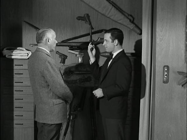 Mel Brooks & Buck Henry: (Unsuccessful at this, he removes his gun and shoots the lock off...) |