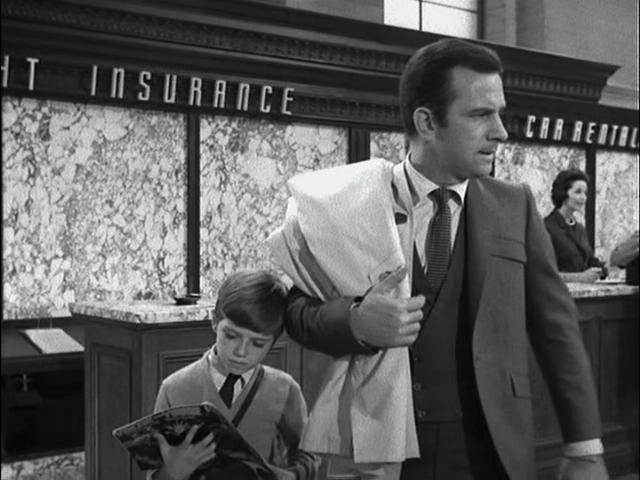 Mel Brooks & Buck Henry: "(PA System) Flight 92, Transcontinental Airlines, now departing Gate 7." (Max enters with Fang) "(Max) Sit, boy. Come on. Sit. Sit. Good boy. Stay here." |