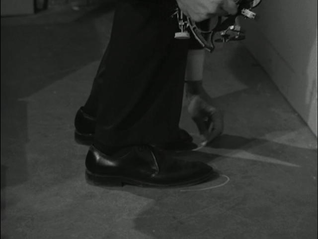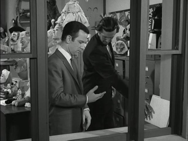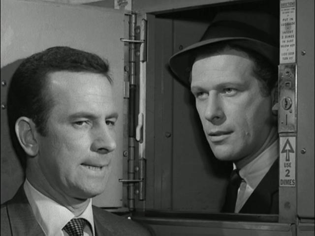 Mel Brooks & Buck Henry: "(Max) Gun under his raincoat. Probably KAOS agent. Put Plan Y-14 into effect. 99 and I will act as decoys. All right?" "(34, smoothly) All right." (Max closes the locker, goes back to 99 and takes his coat.) |