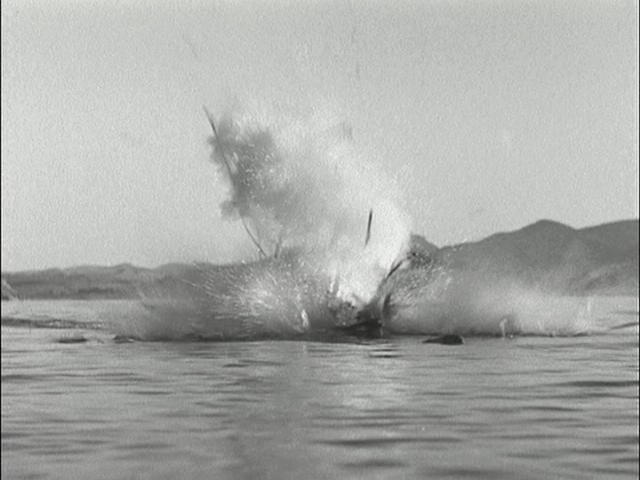 Mel Brooks & Buck Henry: (Four armed KAOS hoods in wetsuits pop up out of the garbage.) "(Thug) Toss the gun overboard." (Max complies) "(Gun) Splash!" |